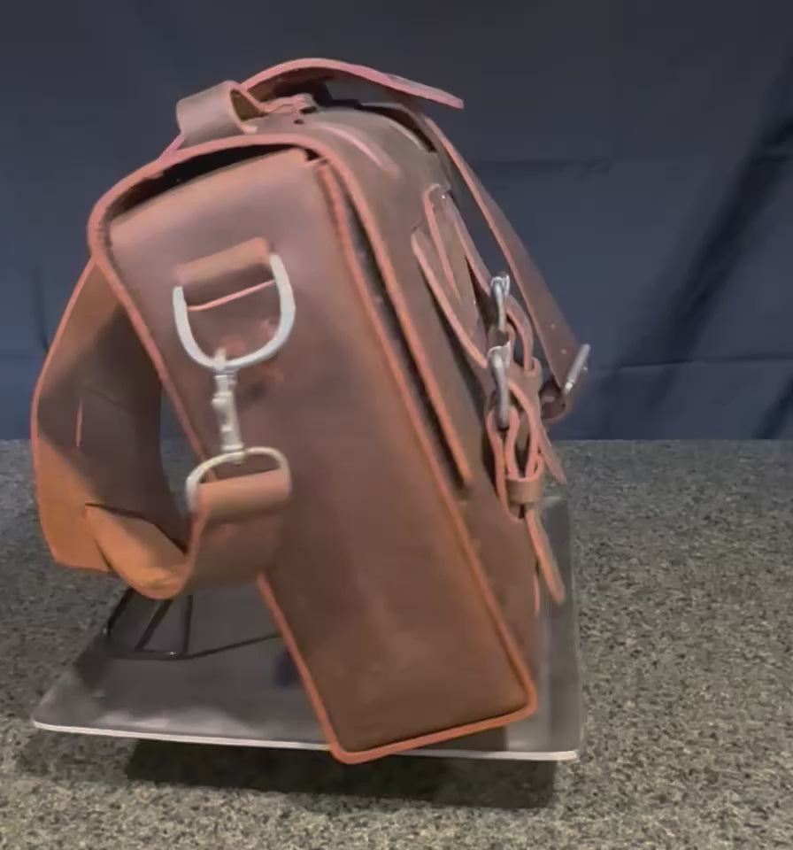 Simple minimalist lines, heavy gauged thread, copper rivets, the beefiest buckles in the industry, and our rugged 10 oz. hide makes our classic satchel, the No. 4313 Minimalist, the strongest satchel on the market with as little excess as possible. Fits a 16" MacBook Pro in addition to a large amount of files, notebooks, and other accessories.